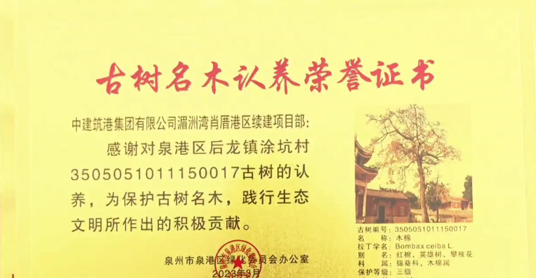 此次认养的木棉树,树龄200多年,树高15米,胸径3.77米,地径5米。该古树是清朝嘉庆年间族人刘肇元考中进士时,皇帝御赐树种,刘肇元种植于曾经寒窗苦读的文馆侧畔,与亭子交相辉映。该木棉树又被涂坑村民亲切地称呼为“英雄树”“露头树”。