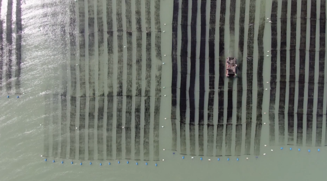 在五里海沙附近的海面上,一颗颗浮球上固定着紫菜架。紫菜架由两根竹竿捆绑搭建,而每两根竹竿间形成的空间就是紫菜生长的平台。星星点点的紫菜采收船穿梭其间,渔民们正顶着海风采收紫菜,“海上菜园”呈现出一派丰收忙碌的景象。