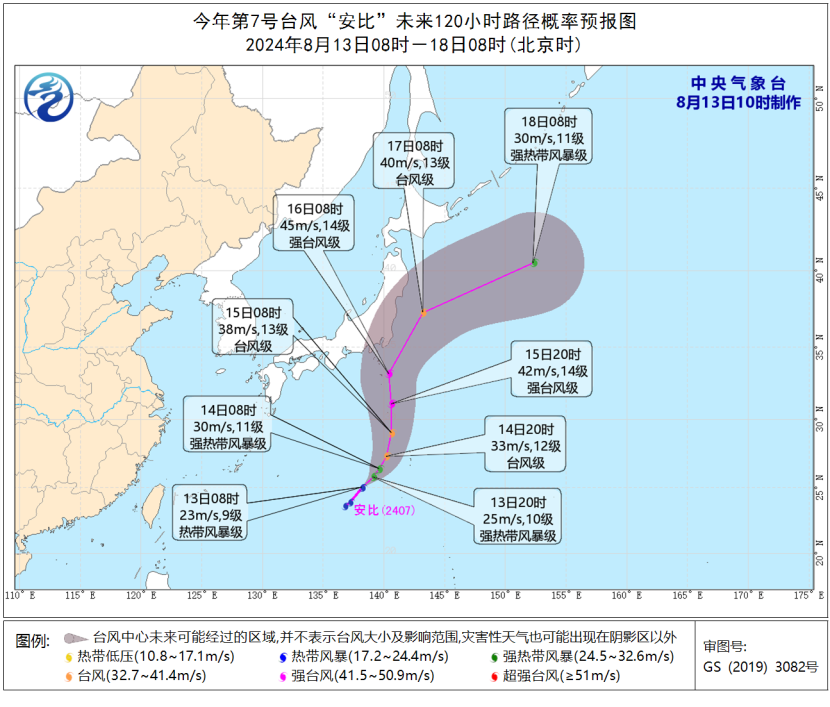 预计,“安比”将以每小时10公里左右的速度向东北方向移动,8月14日前后转向偏北方向移动,强度逐渐增强,未来对我国海域无影响。