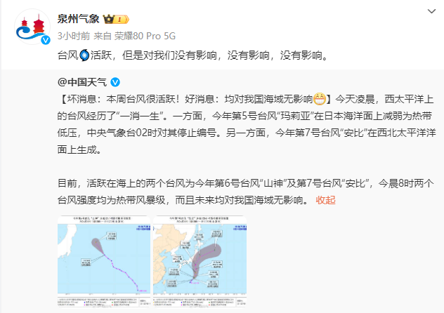 8月13日凌晨,中央气象台发布台风停编消息:5号台风“玛莉亚”于今天(8月13日)凌晨2时在日本海洋面上减弱为热带低压,随后其风力进一步减弱,已很难确定其环流中心,中央气象台2时对其停止编号。
