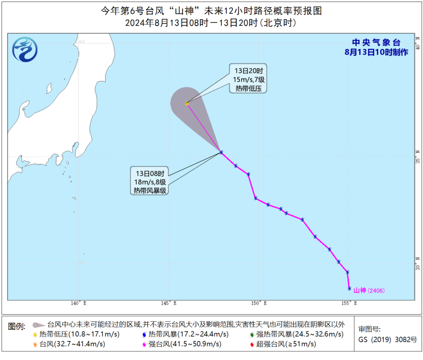 今年第6号台风“山神”(热带风暴级)的中心今天(13日)上午8点钟位于日本东京偏东方向约750公里的洋面上,就是北纬35.2度、东经147.9度,中心附近最大风力有8级(18米/秒),中心最低气压为998百帕,七级风圈半径100~200公里。