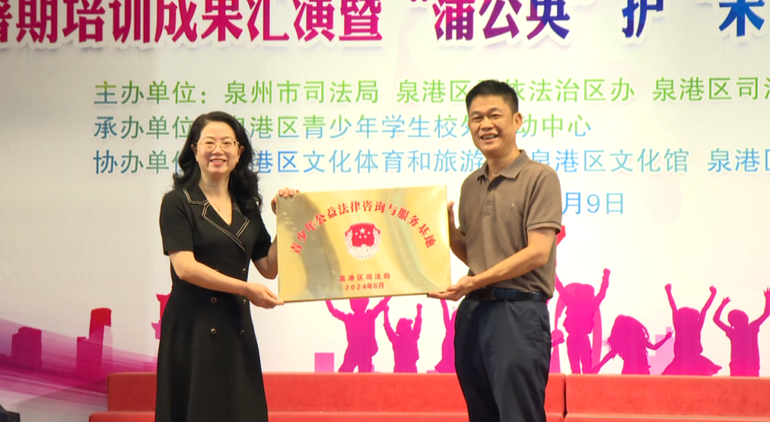 活动中,与会领导为泉港区“蒲公英”公职律师普法志愿者小队授旗,向福建湄港律师事务所授予“泉港区青少年公益法律咨询与服务基地”牌匾。