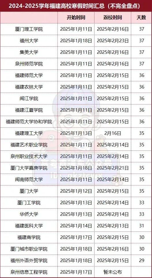 目前,超20所福建高校已公布寒假时间。大部分高校的寒假从2025年1月中上旬开始,2月中下旬左右结束,寒假天数在29天到37天。