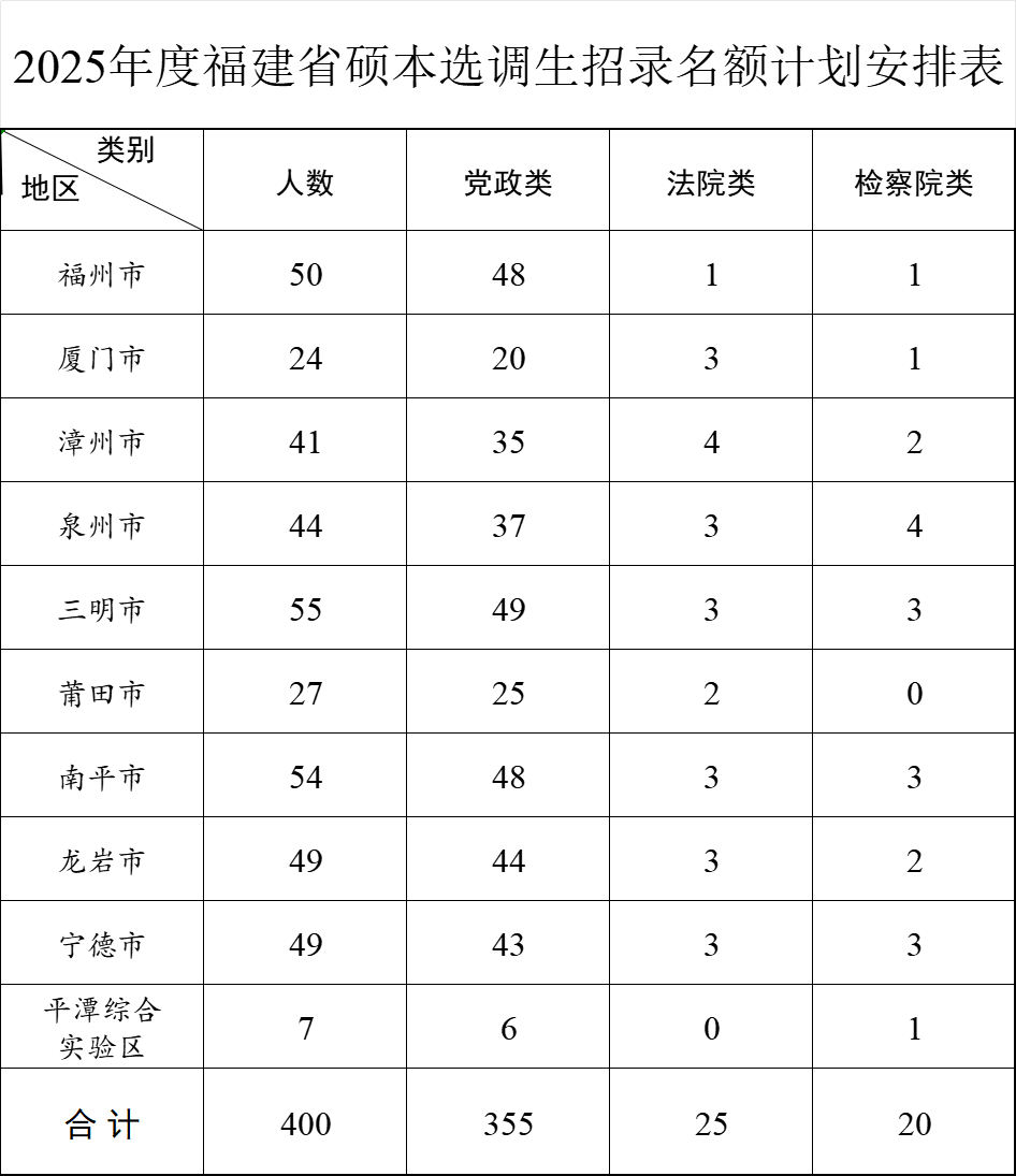 (一)计划从省内外〔不含国(境)外,下同〕部分高校(见附件1)福建生源2025年全日制应届硕士、本科优秀毕业生中,选拔选调生400名(见附件2),其中:党政类355名、法院类25名、检察院类20名。