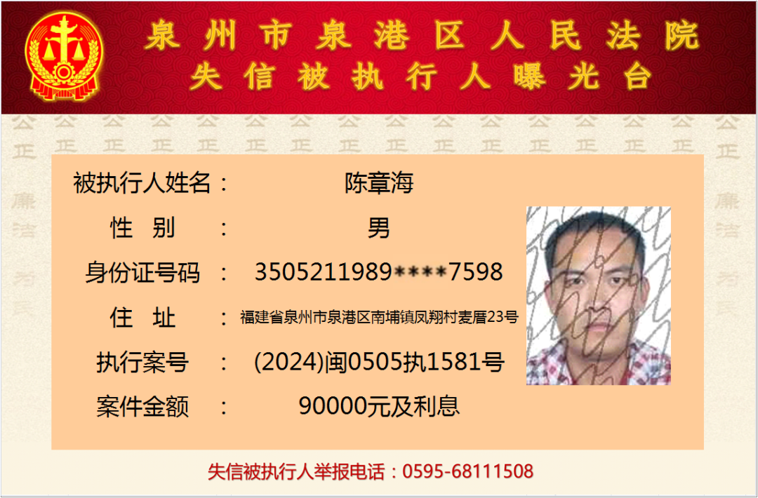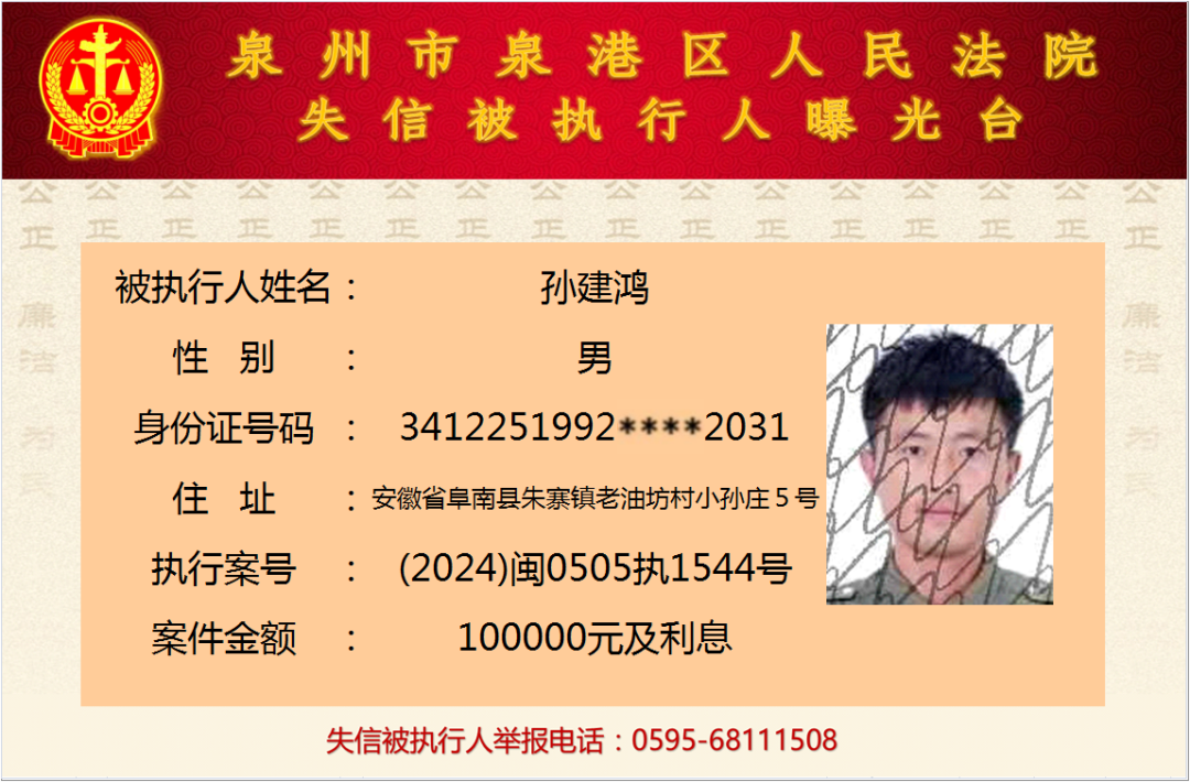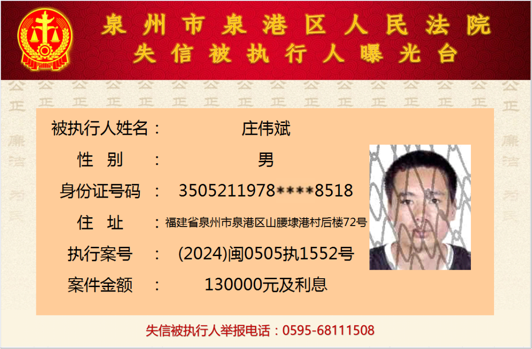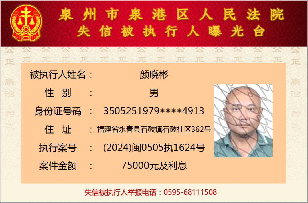 为维护法律的尊严和权威,弘扬社会诚信风气,根据相关法律规定,现将以下失信被执行人予以曝光。对有财产拒不履行已经发生法律效力的判决、裁定的,本院将依法予以司法拘留,构成犯罪的,将依法移送公安机关立案侦查追究刑事责任。欢迎广大群众举报失信被执行人财产线索,举报方式:泉港区人民法院执行局(0595-68111508)