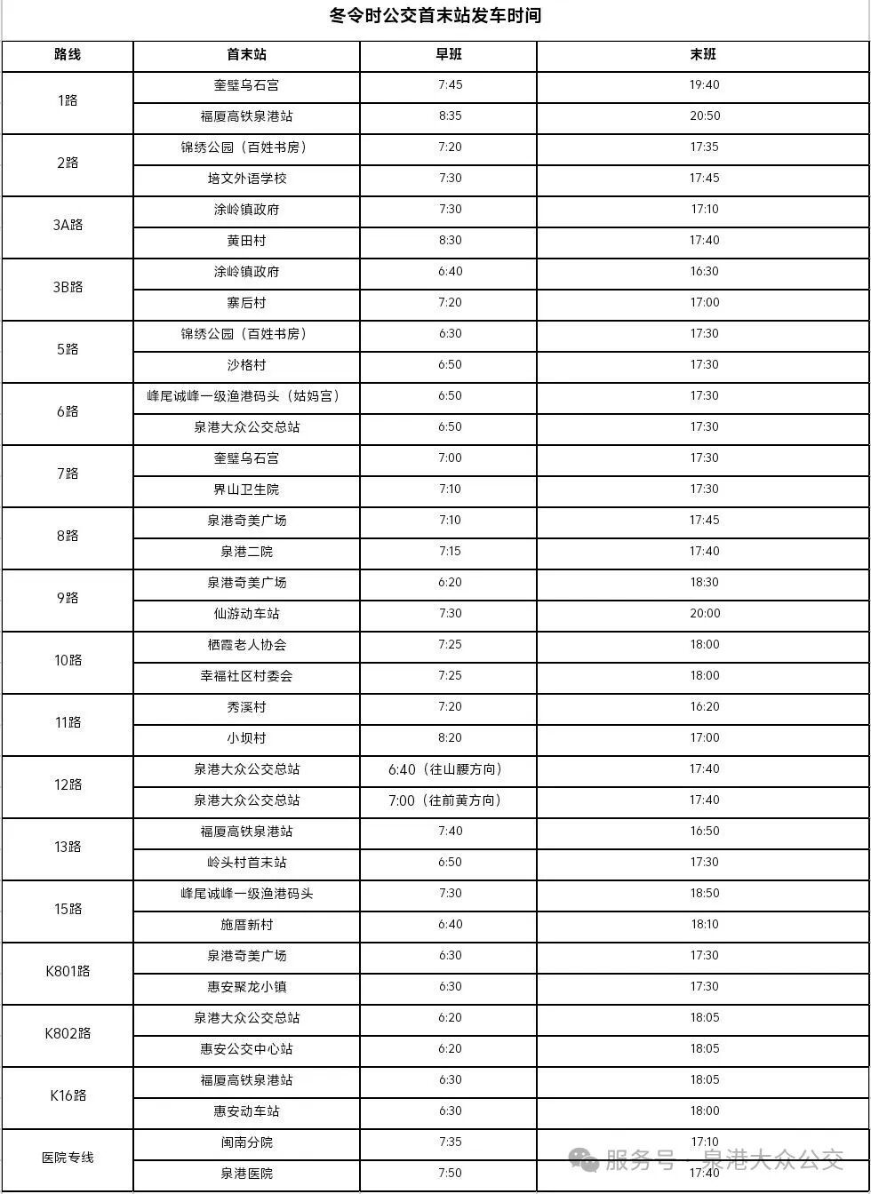 随着天气逐渐转凉,市民的工作、生活作息时间随之变化,为方便市民出行,泉港公交自2025年10月10日起实行冬令时运营时间,具体方案如下: