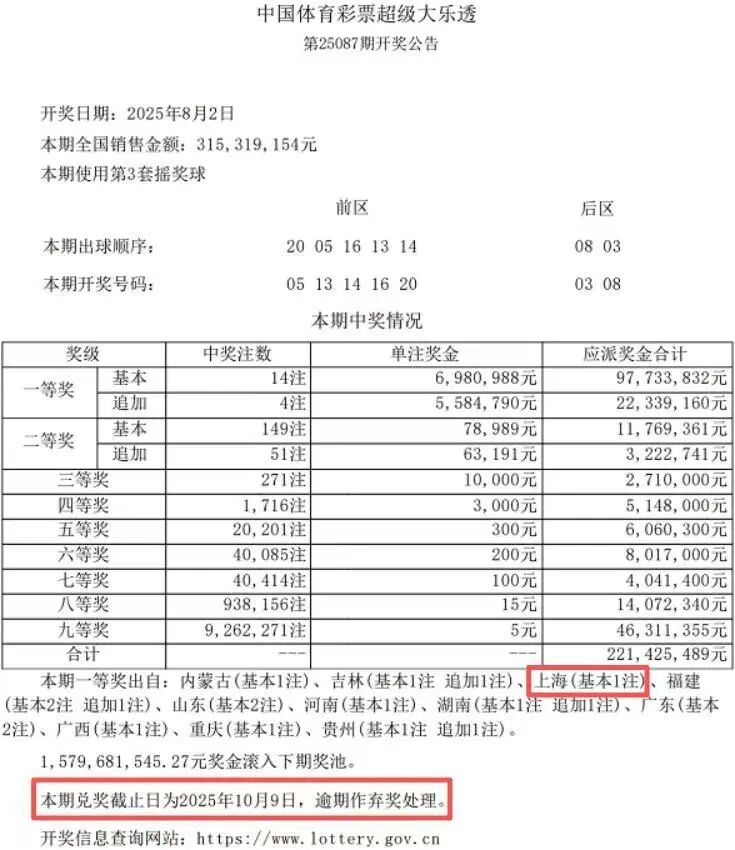 8月2日,超级大乐透第25087期开奖。前区开出号码05、13、14、16、20;后区开出号码03、08。当期上海开出1注基础一等奖,中奖彩票为一张金额42元的“7 2”复式票,单票奖金701万余元。该张大乐透一等奖彩票出自位于奉贤区航南公路5639-5699号3F(宝龙广场)的市属51907网点。该期大乐透兑奖截止时间为2025年10月9日。