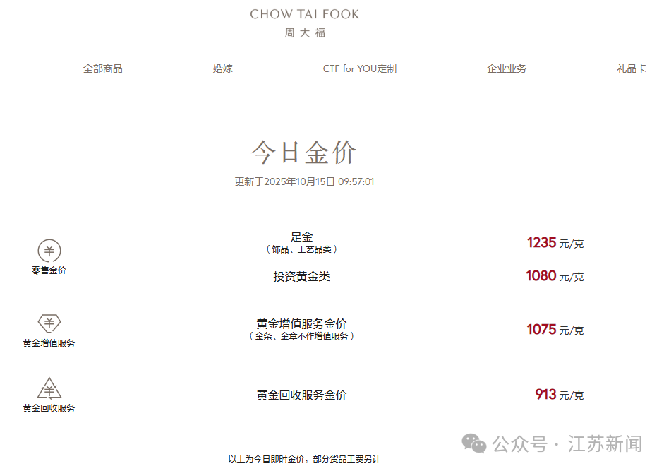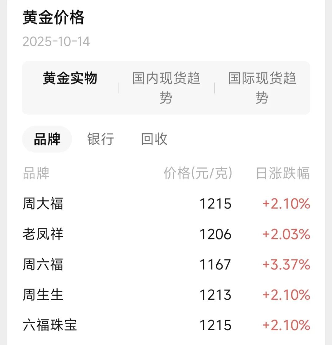 国内品牌金饰品克价也随之上涨