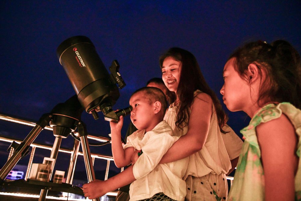 2025年7月9日,游客在贵州省平塘县克度“天文小镇”通过望远镜观测星空。近年来,随着旅游设施逐渐完善,距离“中国天眼”仅8公里的克度“天文小镇”通过“科普 文旅”发展模式,带动村民就业创业、增收致富。2025年1月至6月,“中国天眼”景区共接待游客约38万人次,总收入2496万余元。
