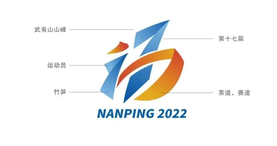 邀请中央美术学院范迪安院长(北京冬奥会会徽设计团队)设计。会徽标志提炼南平特色元素,“福”字的右边是以武夷山玉女峰和大王峰的形意作为主体设计构架,整个“福”字的形态是借助竹子向上生长的姿态,以干净利落有力量的笔触,勾勒出蓬勃向上的朝气感,同时还融合了“运动、飘带、赛道”等体育元素,以中国书法顿挫有致的笔势描绘出具象的“福”字图标。