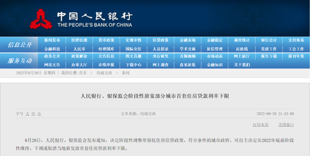 而这一调整的政策支撑,来源于9月29日中国人民银行、银保监发布的阶段性调整差别化住房信贷政策的通知。