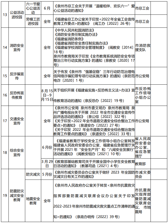 为进一步规范社会事务进校园管理,切实减轻中小学师生非教育教学负担,保障教师聚焦主责主业,根据《中共泉州市委办公室 泉州市人民政府办公室关于贯彻落实<福建省中小学教师减负清单>的通知》,近日,泉州市教育局公布了最新的泉州市中小学校社会事务进校园活动清单。