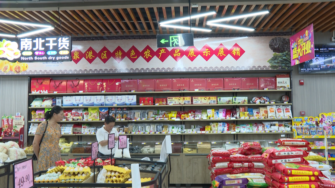 走进超市,店内明亮整洁、货架整齐,各类生活用品、蔬菜水果、农资器具等一应俱全,吸引了周边诸多居民前来选购。其中,泉港本地农产品展示区更是引人驻足。