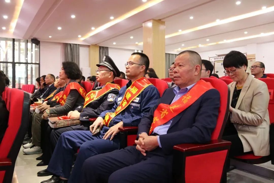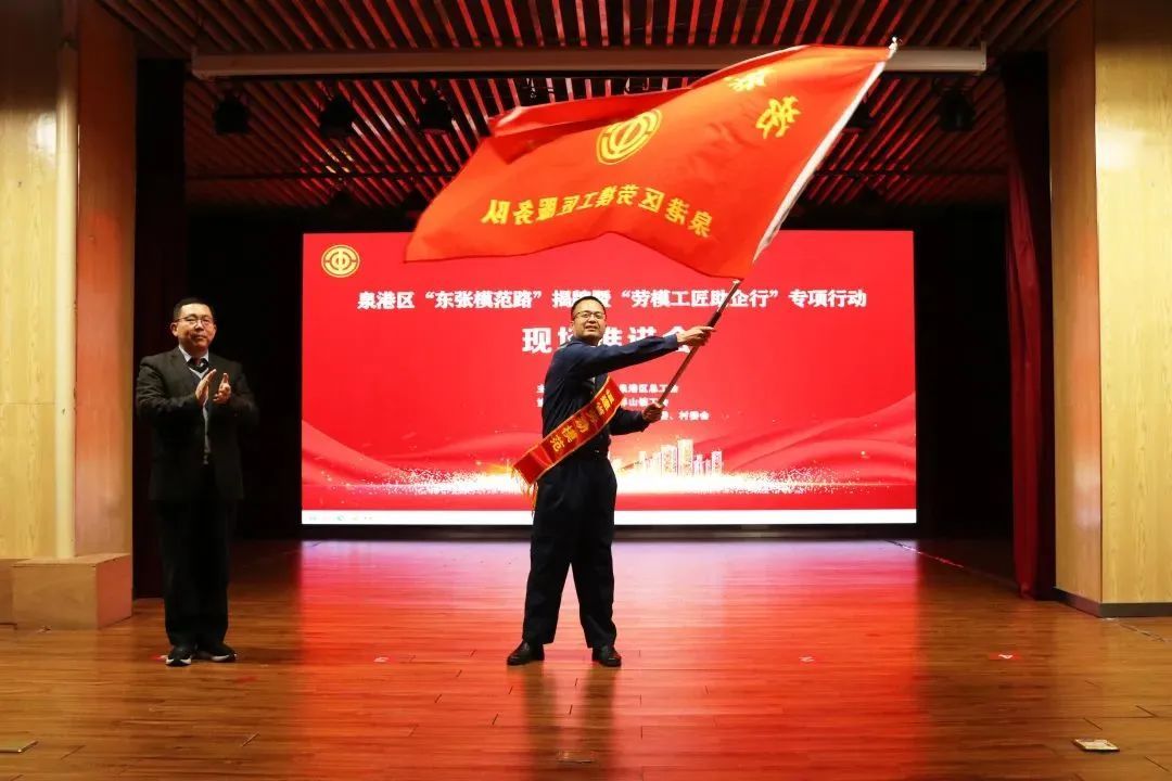 市总工会领导为泉港区“劳模工匠助企行服务队”授旗,福建省劳模、福建省联合石化公司生产运行支持工程师吴良江上台接旗。