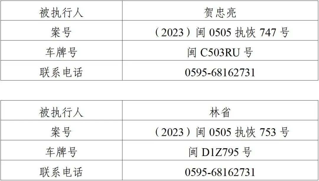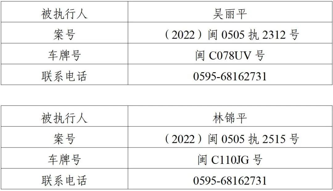 一、责令被执行人自本公告之日起五日内将你(单位)名下车辆交付至泉州市泉港区人民法院执行局(联系人:林警官,联系电话:0595-68162731)。