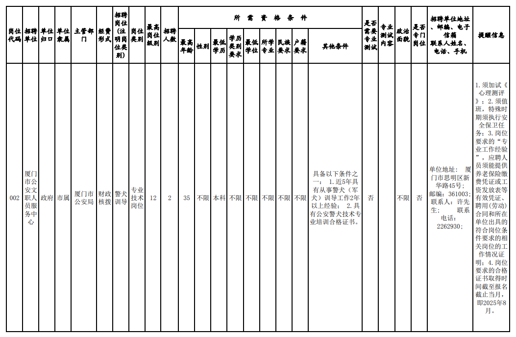 厦门市公安文职人员服务中心公开招聘专业技术岗位人员5名