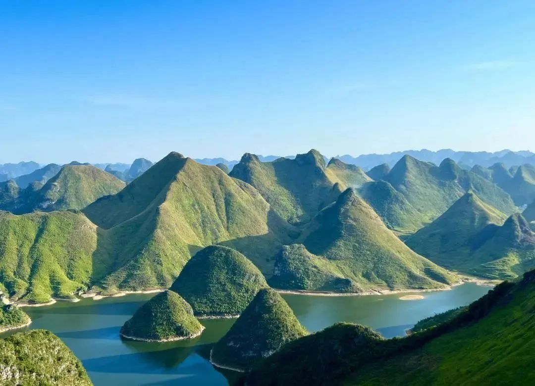 位于广西的剑龙山,因山脊轮廓酷似远古生物剑龙的背脊而得名。其陡峭山势与周边碧绿的田野、蓝宝石般的湖泊形成强烈对比,被网友称为“抹茶群山”,美丽的景色让它成为游客争相打卡的网红景点。