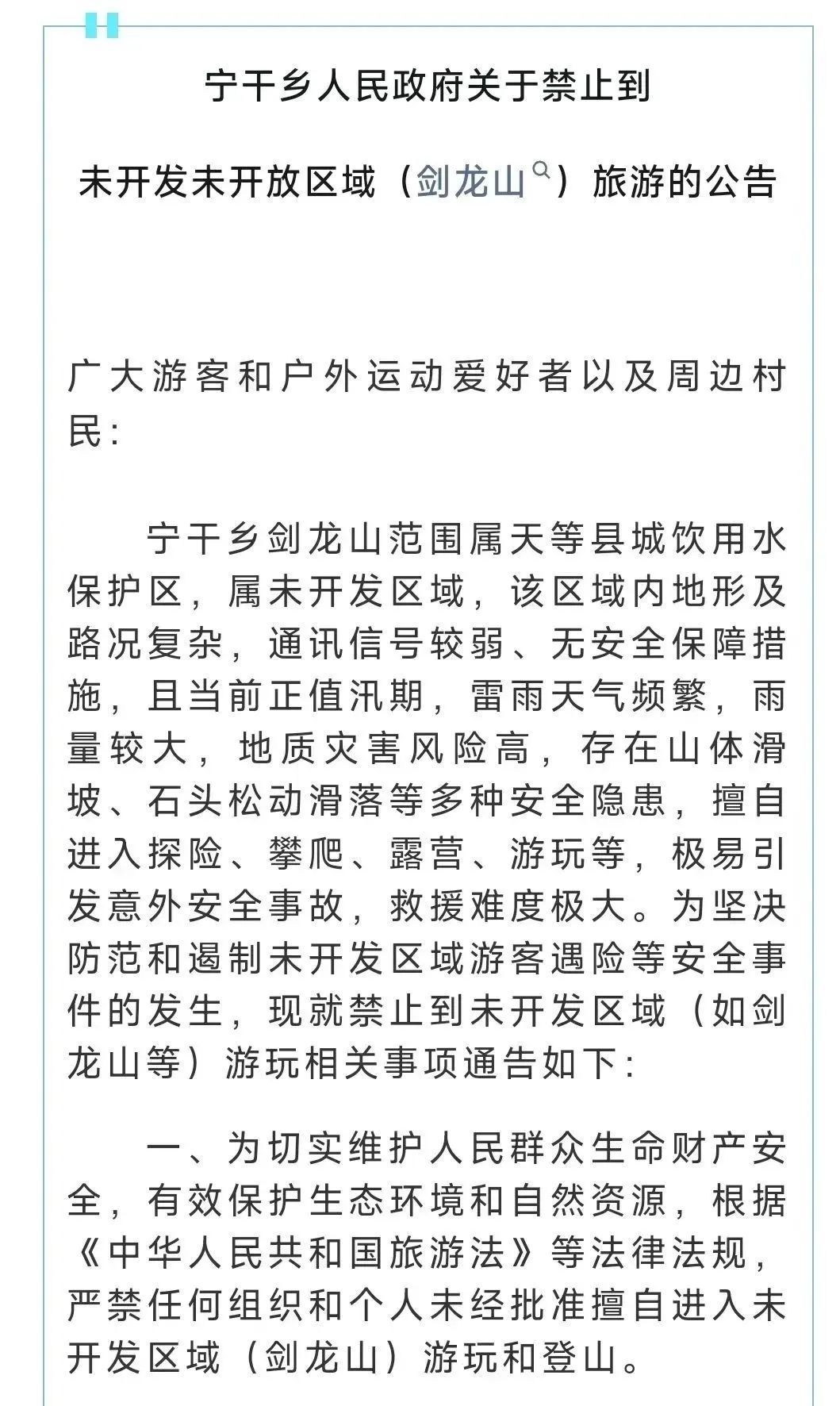 广西崇左市宁干乡政府8月10日发布公告称,严禁任何组织和个人未经批准擅自进入未开发区域(剑龙山)游玩和登山。