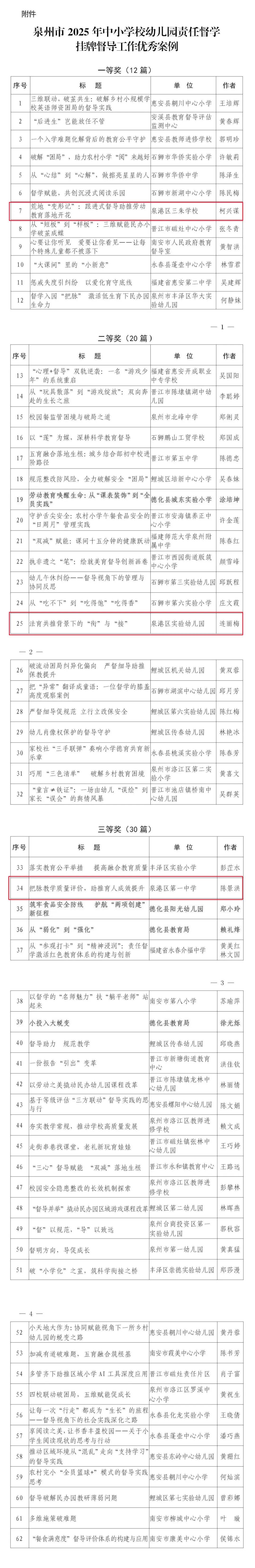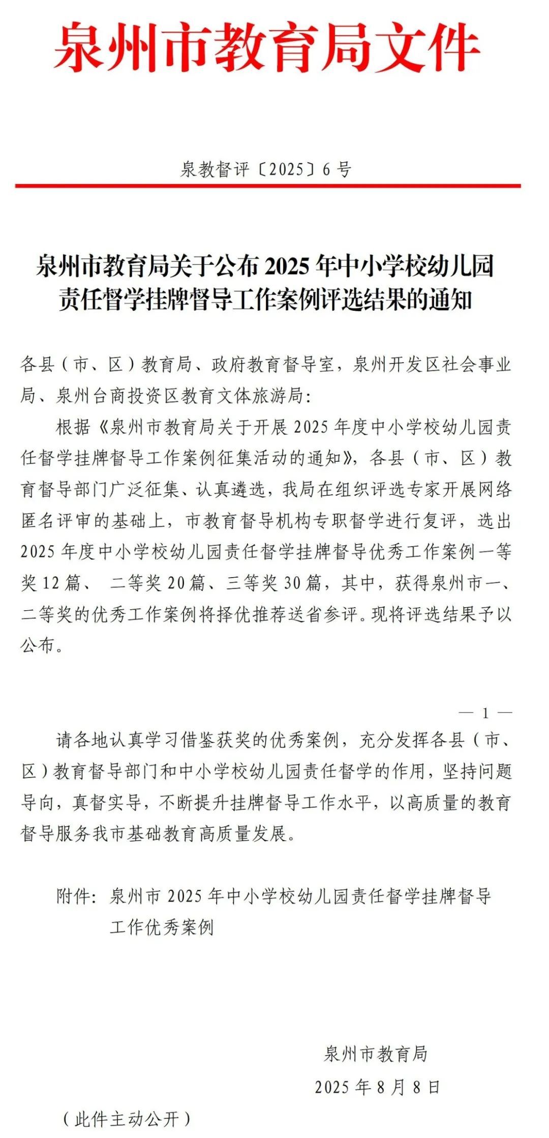 近日,泉州市教育局公布2025年中小学校幼儿园责任督学挂牌督导工作案例评选结果,泉港区共有3篇工作案例获奖,其中一等奖1篇,二等奖1篇,三等奖1篇。