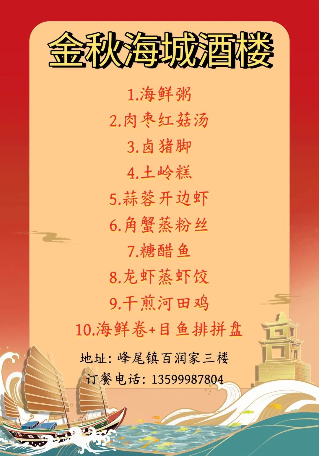 开渔的号角已经吹响,大海的丰饶正跃上餐桌!峰尾镇重磅推出——“开渔节专属海鲜套餐”活动!588元即可抢购享受原价超800元的6-8人海鲜盛宴,让您与家人朋友畅享第一网鲜味!