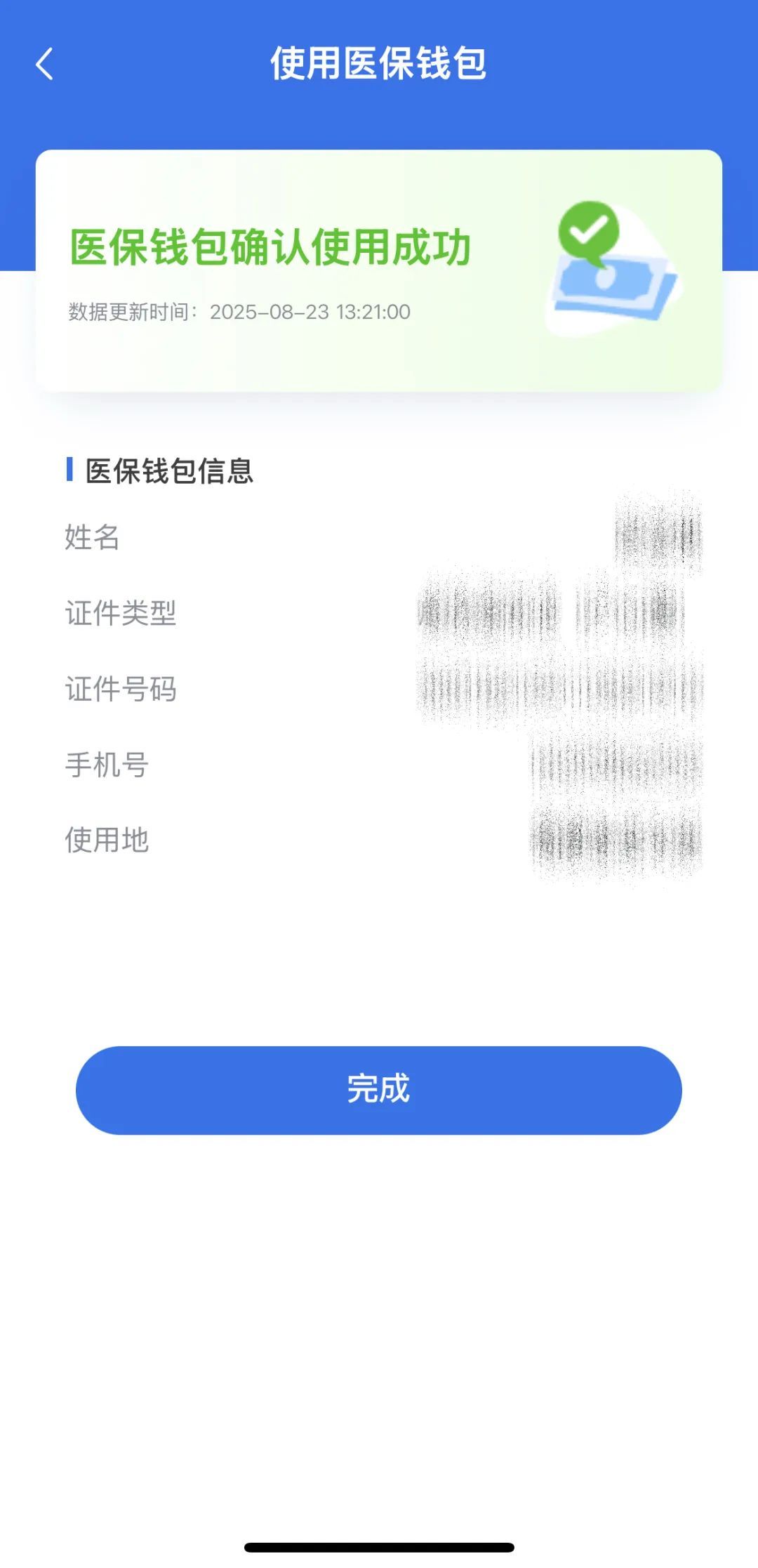 使用医保钱包界面返回成功之后,点击完成显示如下: