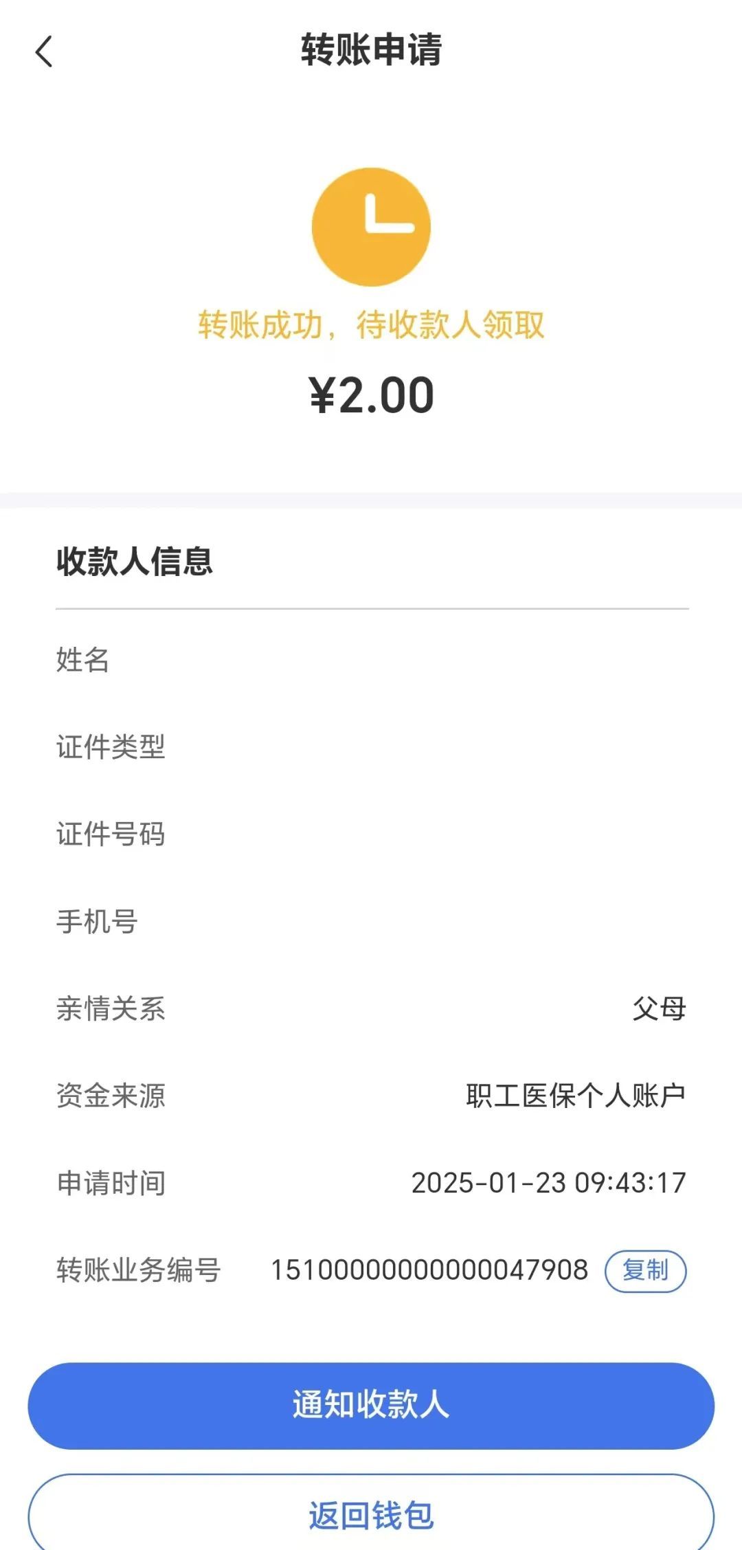 在钱包前面界面,点击:医保钱包转账申请,填写被转账人基本信息,填写完成之后,点击提交,等待返回信息: