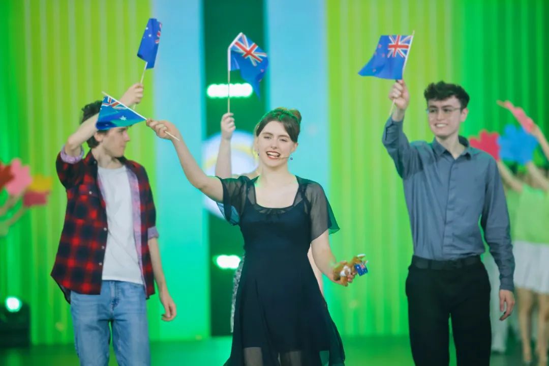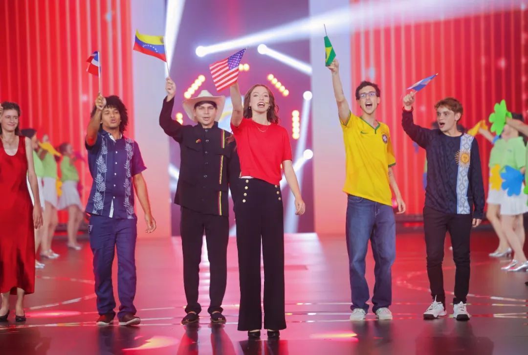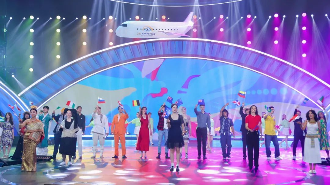 伴随主题曲《梦想起航》的热烈旋律,五位洲冠军携各大洲三十强选手挥舞国旗依次登台,以铿锵有力的参赛宣言展现青春风采,“汉语桥”专属“梦想号”飞艇随之腾空升起,瞬间点燃全场热情,正式开启巅峰对决。