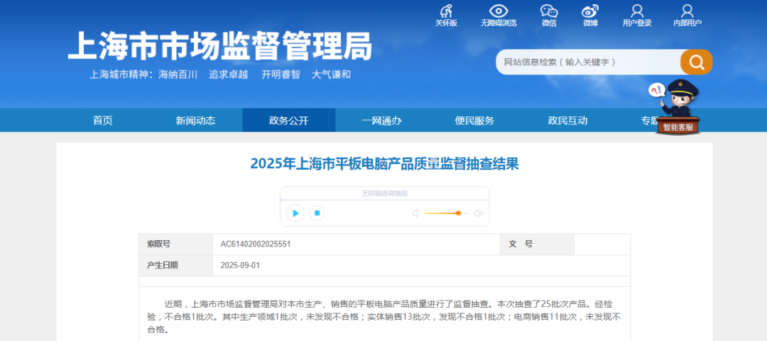 近期,上海市市场监督管理局对本市生产、销售的平板电脑产品质量进行了监督抽查。本次抽查了25批次产品。经检验,不合格1批次。其中生产领域1批次,未发现不合格;实体销售13批次,发现不合格1批次;电商销售11批次,未发现不合格。