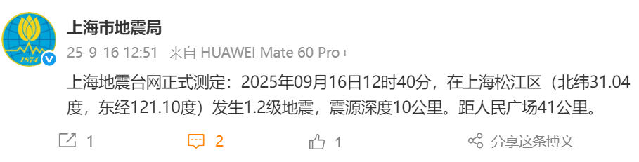 上海地震台网正式测定:2025年09月16日12时40分,在上海松江区(北纬31.04度,东经121.10度)发生1.2级地震,震源深度10公里。距人民广场41公里。