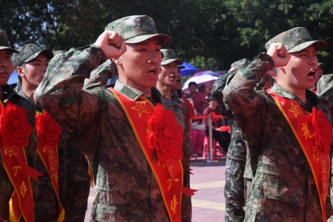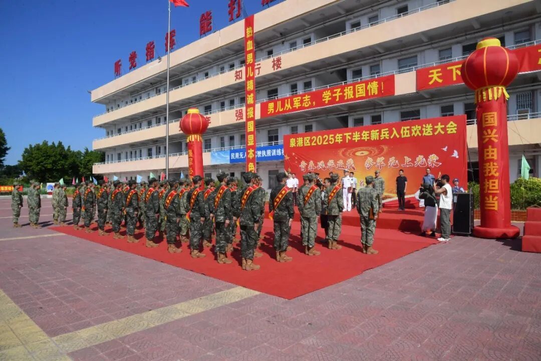 欢送仪式上,新兵们身着作训服、肩披“光荣入伍”绶带,整齐列队、庄严宣誓,目光坚毅、斗志昂扬,展现出泉港青年从军报国的使命与担当。