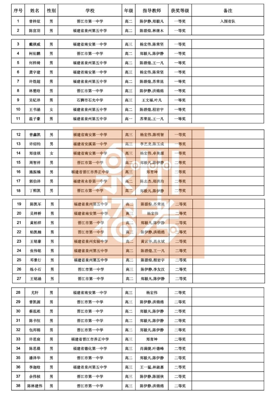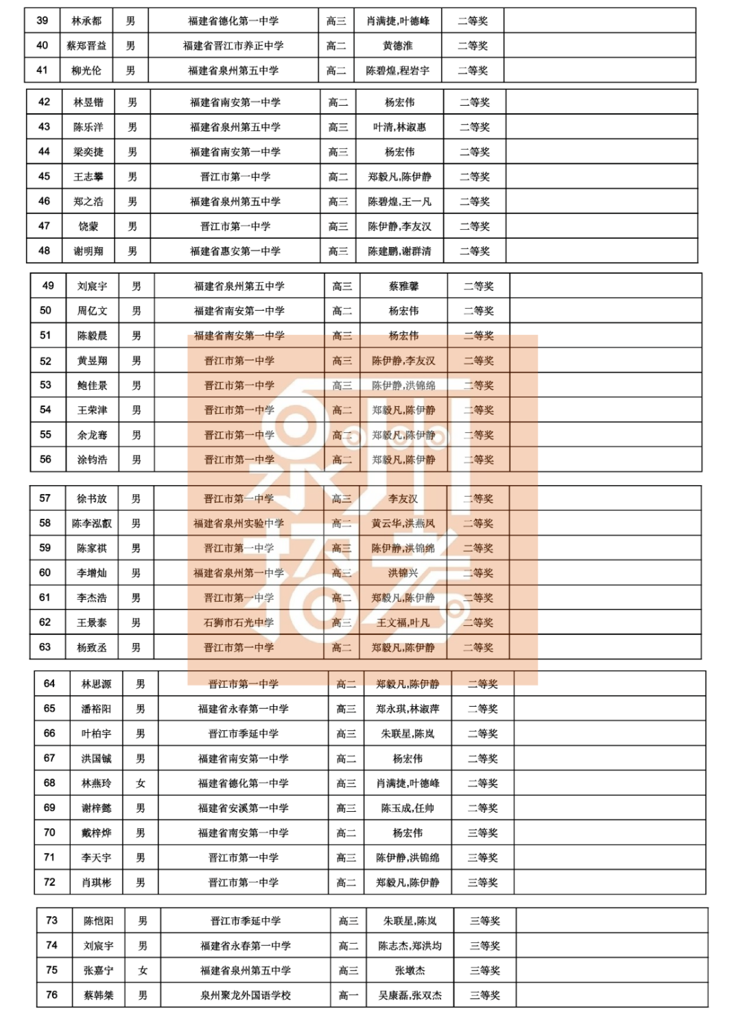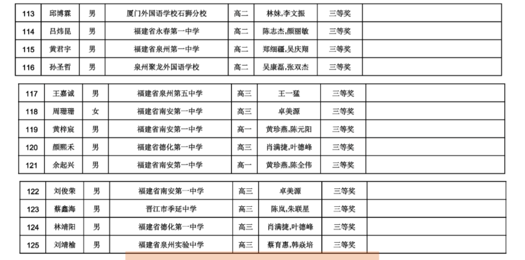 四十二届全国中学生物理竞赛(福建赛区)复赛拟获奖名单和省队名单(泉州)