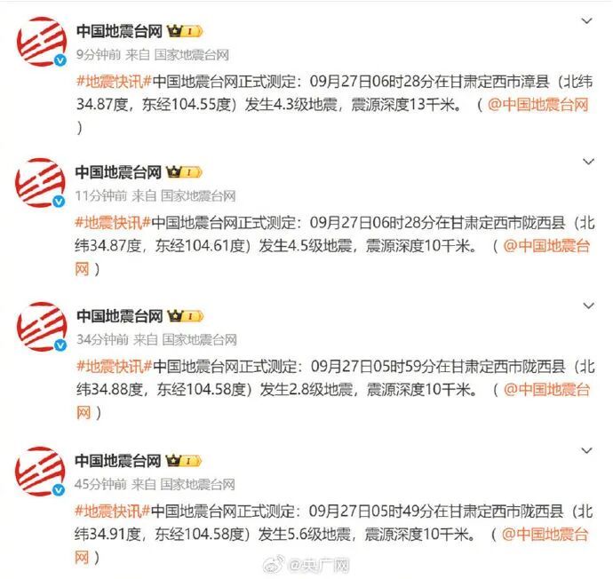 另据央广网,据中国地震台网正式测定:9月27日05时49分至06时28分,甘肃定西市发生5.6级、2.8级、4.5级、4.3级地震。兰州、天水等地震感明显。