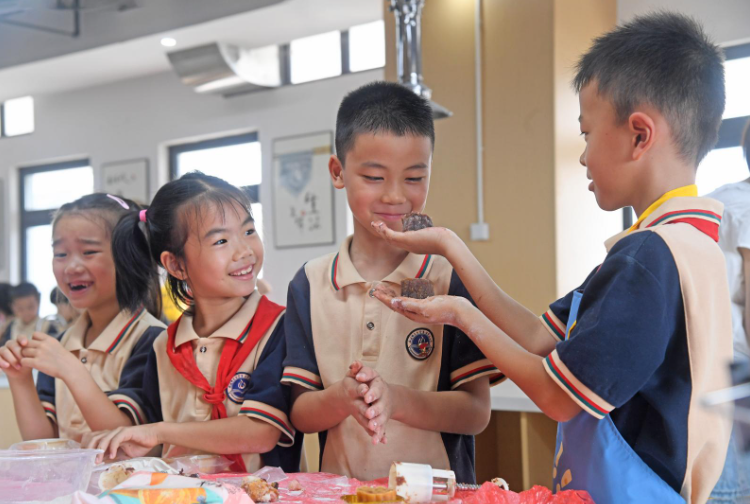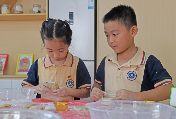 ▲福建师范大学泉港实验小学润心楼厨艺坊,二年级的同学们在包装自己制作的月饼。