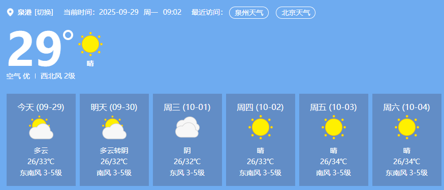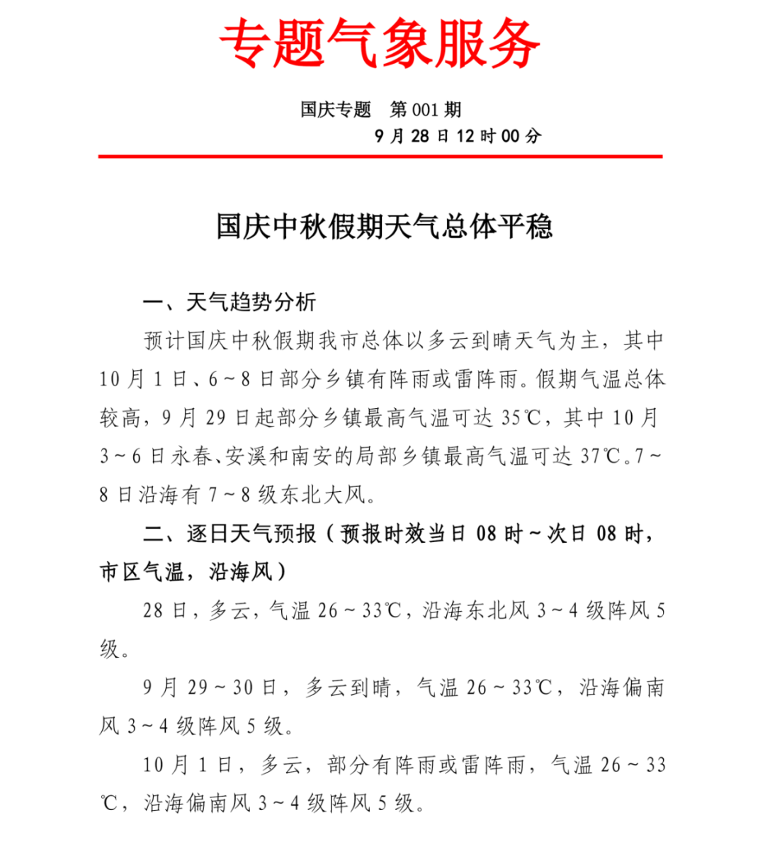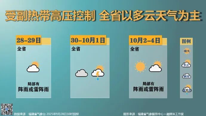 天气:10月1~6日全省以多云天气为主,其中10月1日有分散性阵雨或雷阵雨;7~8日全省阴到多云,部分有阵雨或雷阵雨。