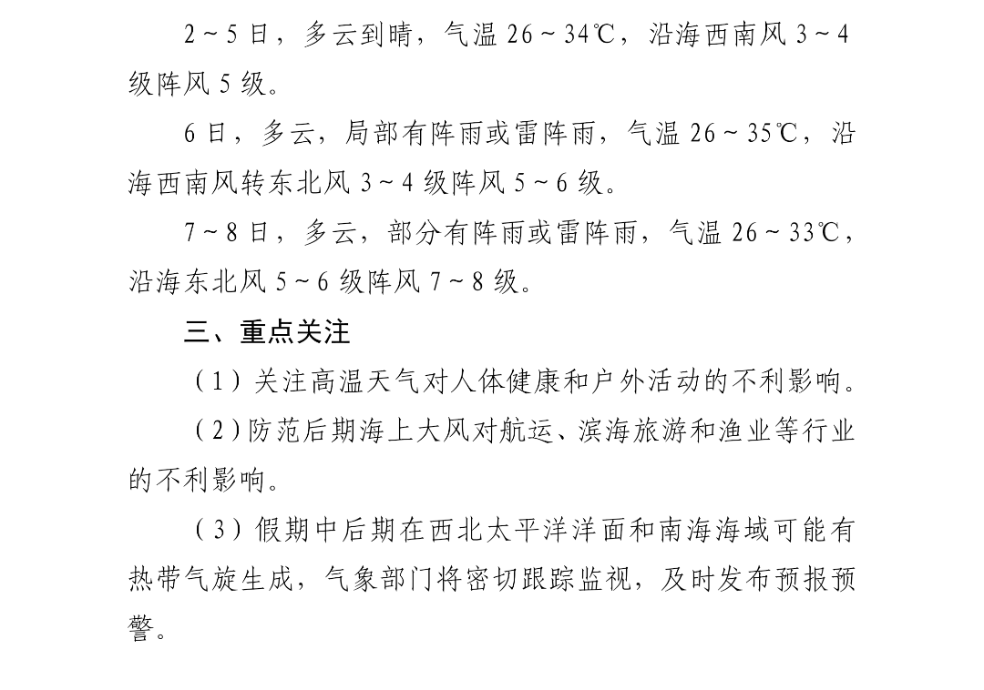 气温:平均气温26~29℃,较常年同期偏高2~6℃;全省大部城区最高气温32~35℃,局部36~38℃,最低气温在22~26℃之间,早晚较为凉爽。