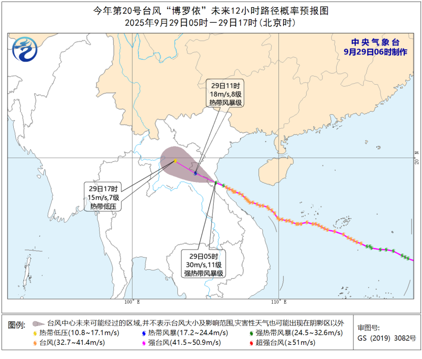 今年第20号台风“博罗依”的中心已于29日1时30分前后在越南河静省沿海登陆,登陆时中心附近最大风力有11级(30米/秒),中心最低气压为980百帕。早晨5点“博罗依”的中心位于越南河静省境内,就是北纬18.4度、东经105.7度,七级风圈半径220—250公里,十级风圈半径60—80公里。预计,“博罗依”将以每小时25—30公里的速度向西偏北方向移动,强度快速减弱。