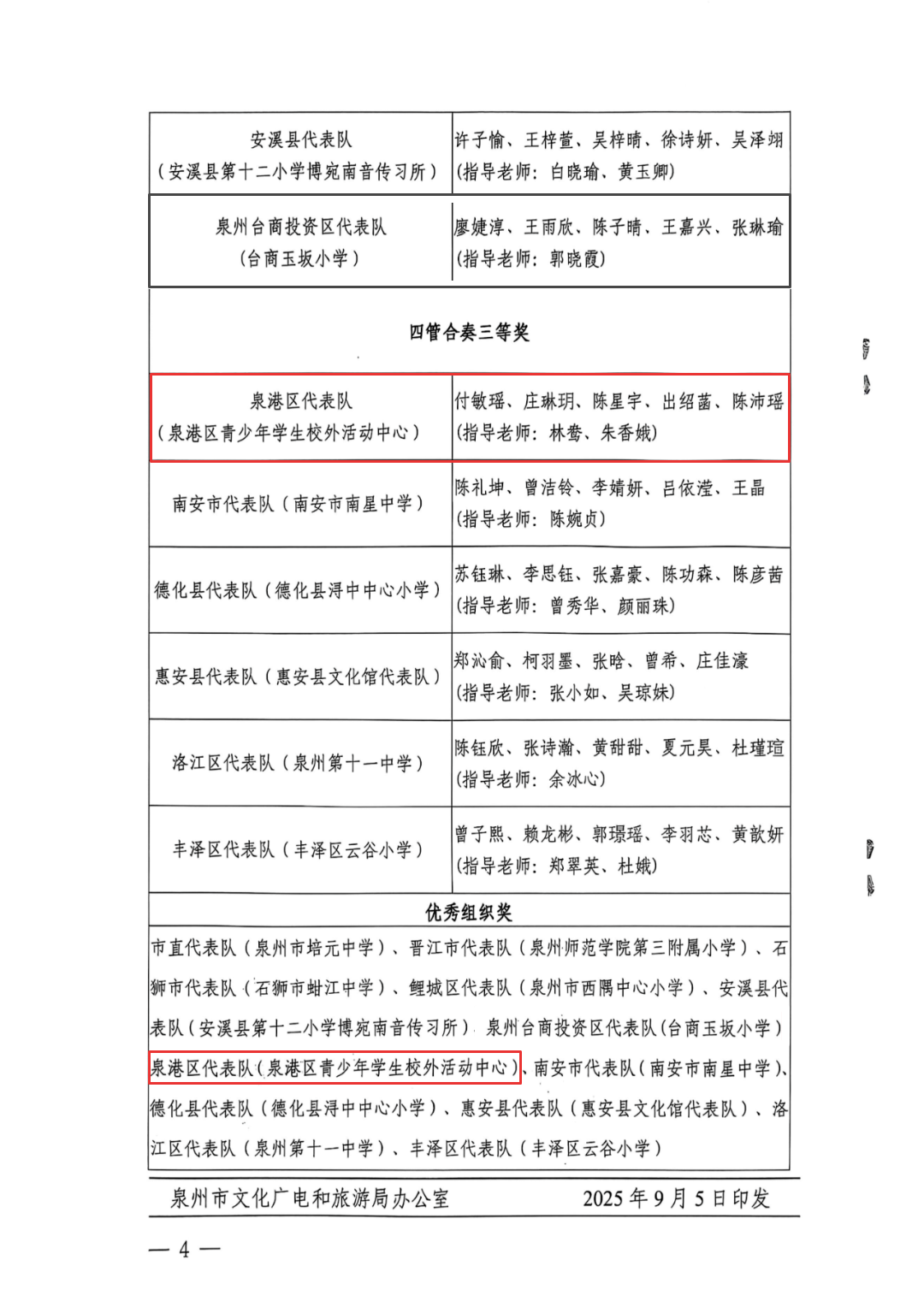 其中,泉港区代表队(泉港区青少年学生校外活动中心)参加“四管合奏”项目获三等奖,泉港区代表队(泉港区青少年学生校外活动中心)获优秀组织奖。