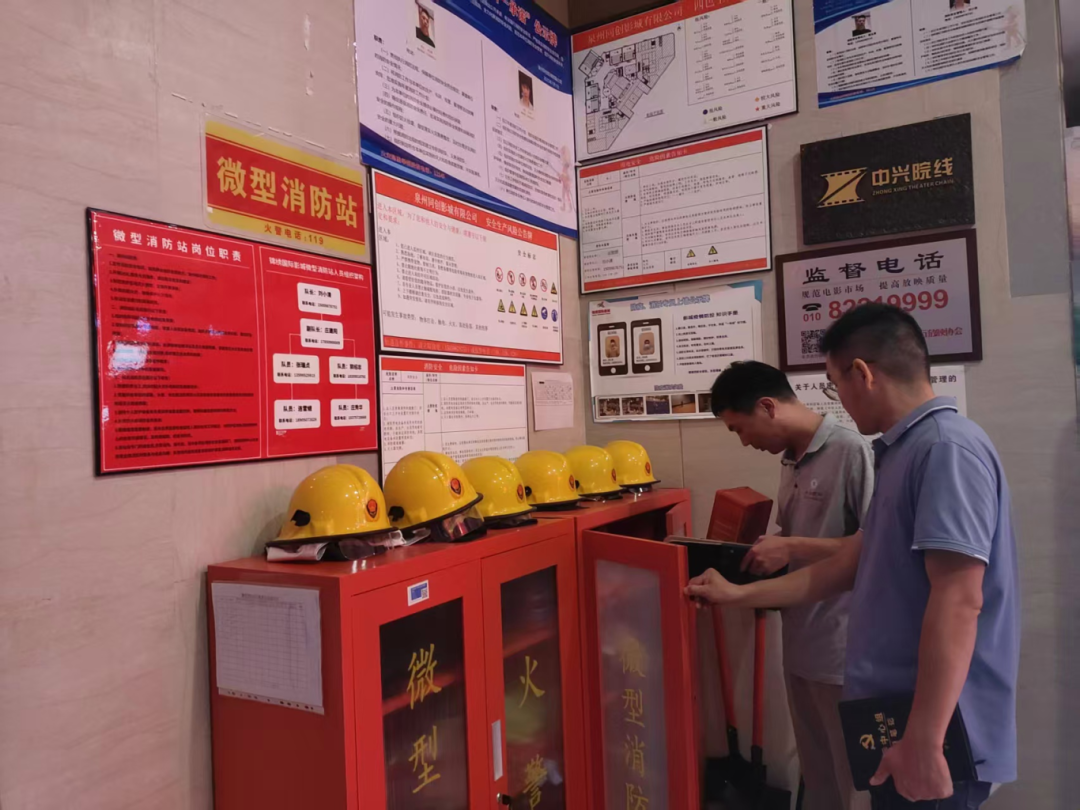 在电影院,检查消防设施是否完好有效,疏散通道是否畅通,随机抽查员工应急处置能力等,并指导落实院线版权保护,强化防盗录宣传。