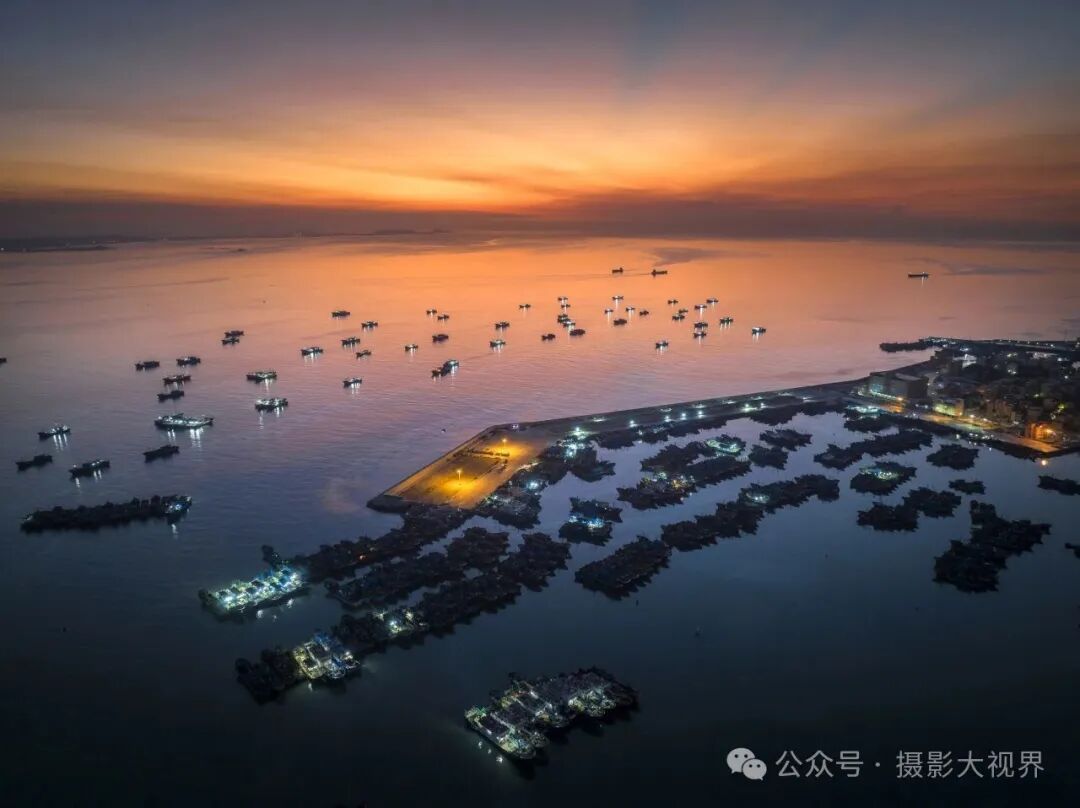 远处的渔船披着霞光出发