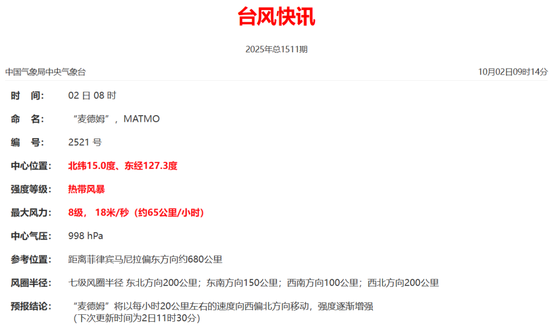气象专家提醒,台风“麦德姆”将于国庆假期后半段给我国华南地区及南海带来明显风雨影响,公众需持续关注最新预报预警信息,提前做好相关防御措施;台风影响前后要远离海边,并将室外的物品收回室内或加以固定,影响时段不要外出、尽量远离窗户,影响后要注意饮食、用水安全。