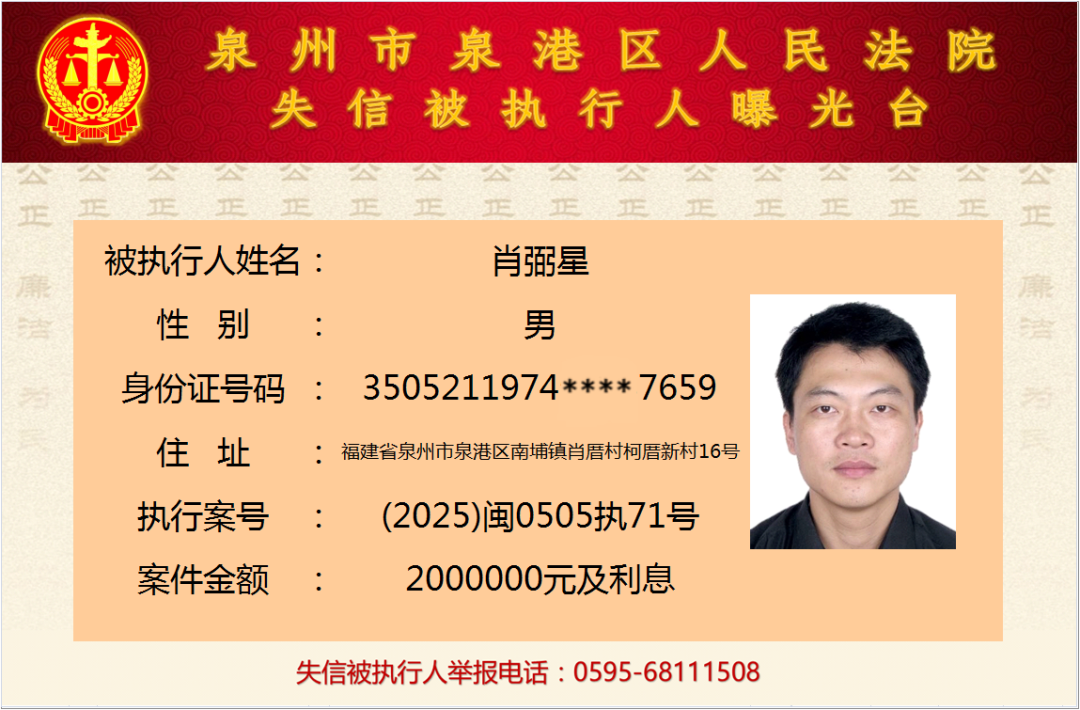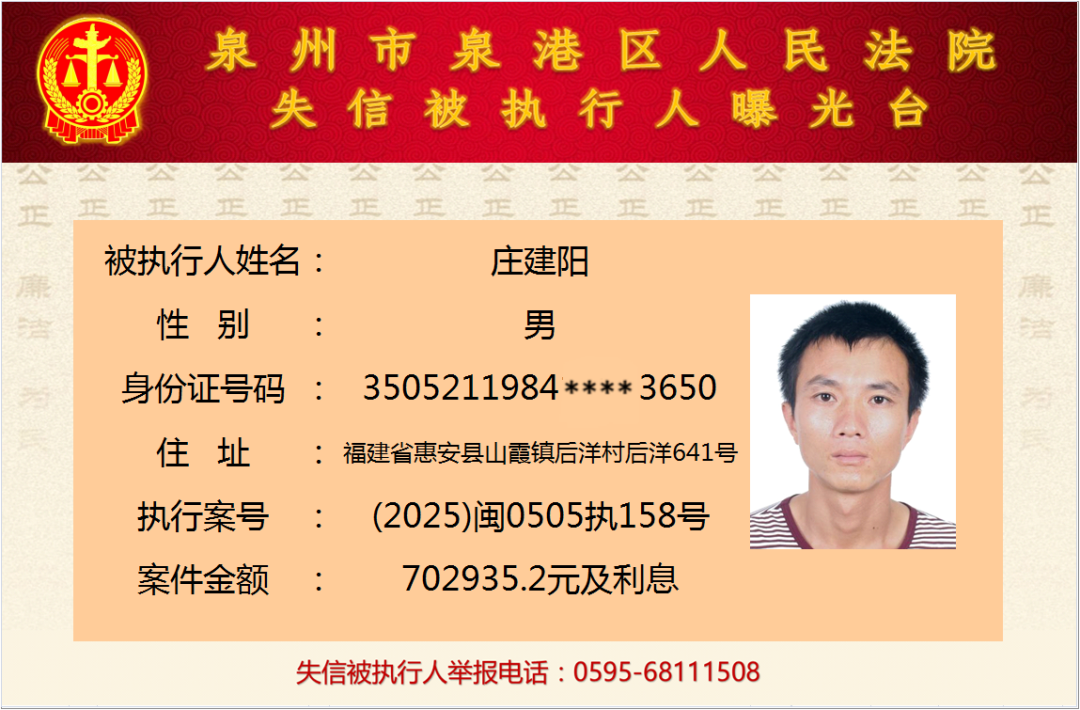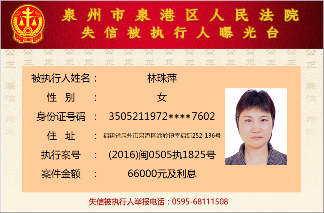 为维护法律的尊严和权威,弘扬社会诚信风气,根据相关法律规定,现将以下失信被执行人予以曝光。对有财产拒不履行已经发生法律效力的判决、裁定的,本院将依法予以司法拘留,构成犯罪的,将依法移送公安机关立案侦查追究刑事责任。欢迎广大群众举报失信被执行人财产线索,举报方式:泉港区人民法院执行局(0595-68111508)