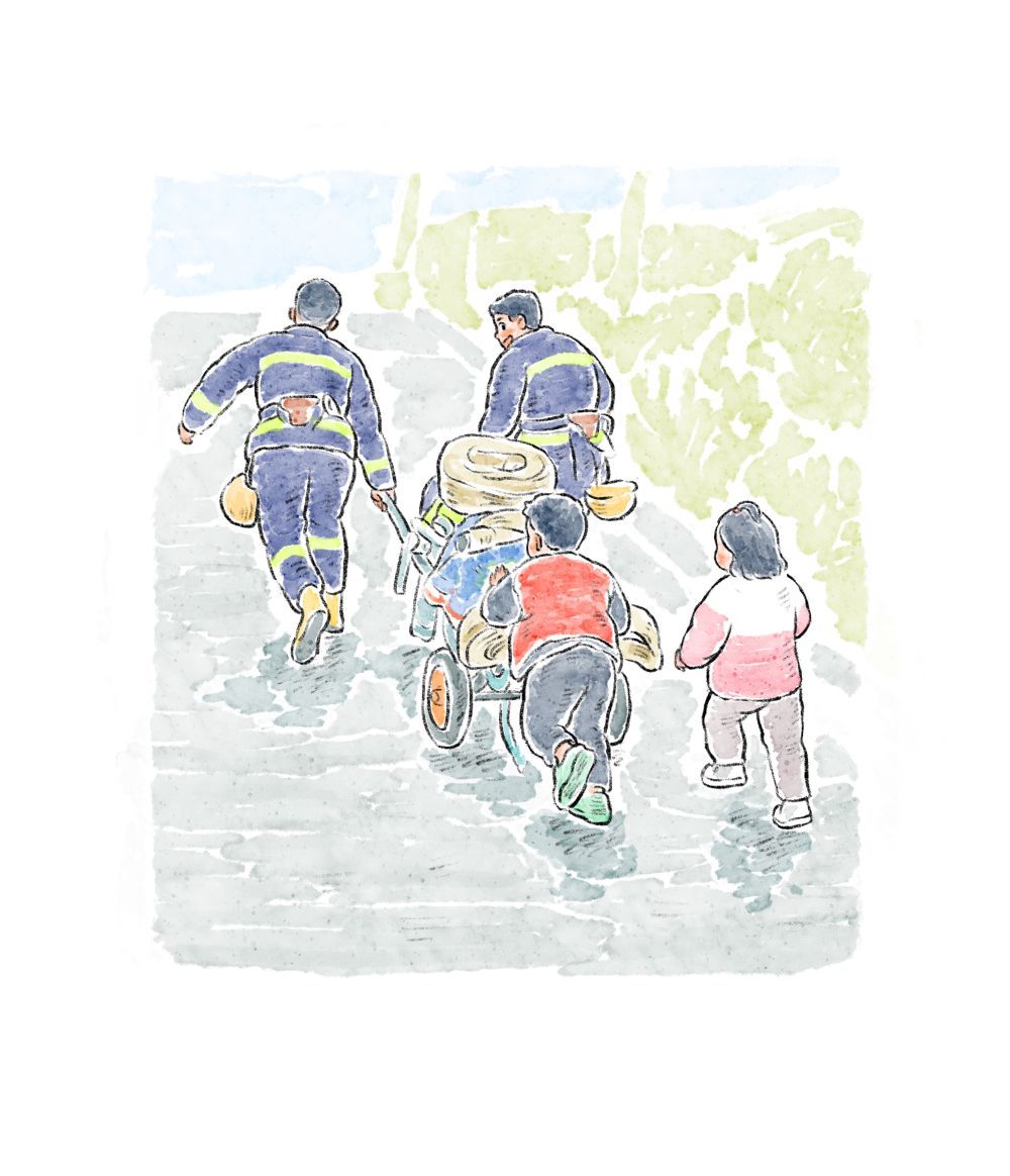 萌娃一路跟随帮消防员推车上坡