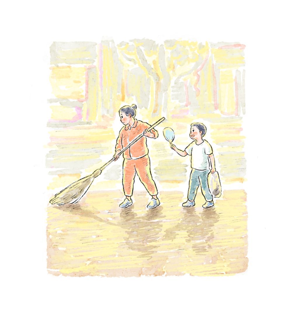 10岁男孩追着给环卫工妈妈扇风