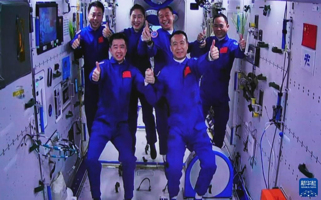 2022年11月30日在酒泉卫星发射中心拍摄的神舟十五号航天员乘组与神舟十四号航天员乘组太空合影的画面。11月30日7时33分,翘盼已久的神舟十四号航天员乘组顺利打开“家门”,热情欢迎远道而来的亲人入驻“天宫”。随后,“胜利会师”的两个航天员乘组,一起在中国人自己的“太空家园”里留下了一张足以载入史册的太空合影。新华社记者 郭中正 摄