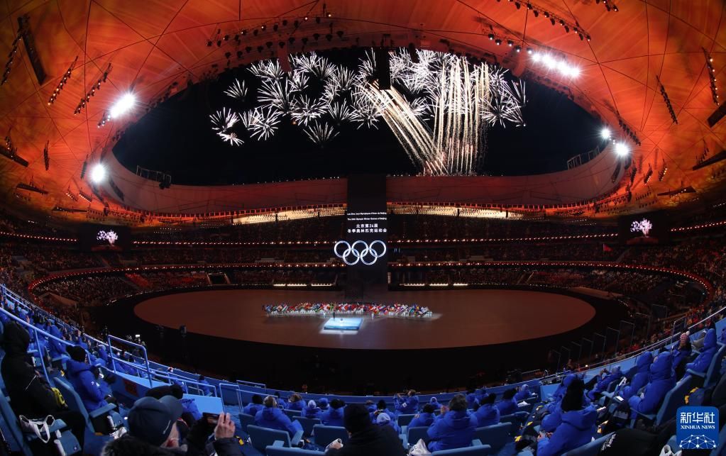 2022年2月4日晚,第二十四届冬季奥林匹克运动会开幕式在北京国家体育场举行。这是开幕式上的焰火表演。新华社记者 徐子鉴 摄