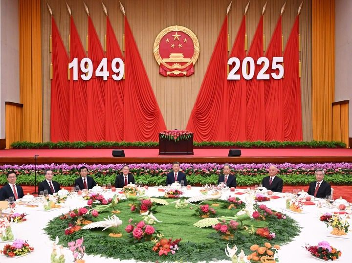 9月30日晚,庆祝中华人民共和国成立76周年招待会在北京人民大会堂举行。习近平、李强、赵乐际、王沪宁、蔡奇、丁薛祥、李希、韩正等党和国家领导人与中外人士欢聚一堂,共庆中华人民共和国华诞。新华社记者 谢环驰 摄