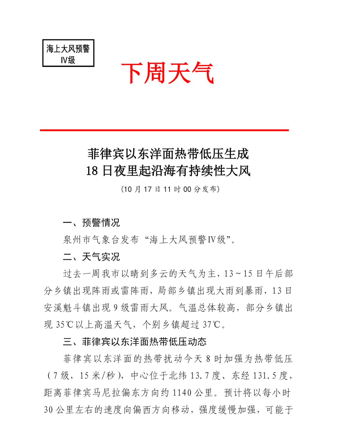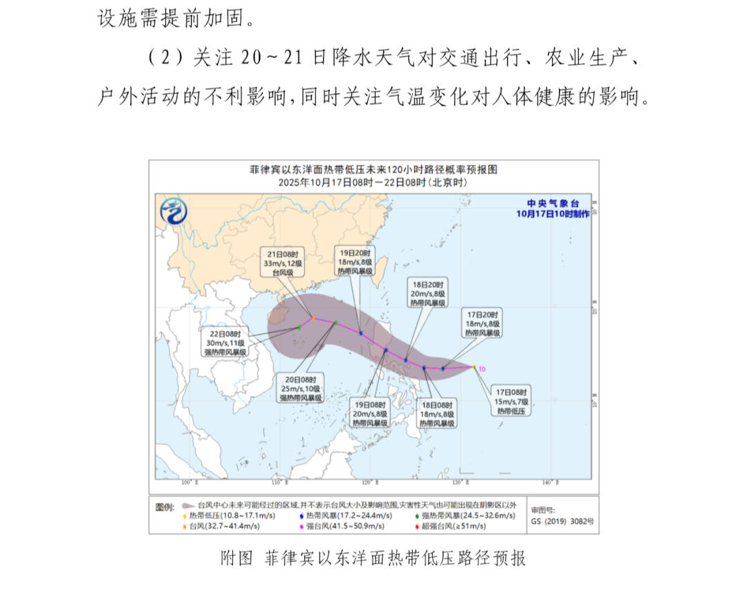 据中央气象台消息,菲律宾以东洋面的热带低压已于今天(10月17日)上午生成,上午8点钟其中心位于菲律宾马尼拉偏东方约1140公里的洋面上,就是北纬13.7度、东经131.5度,中心附近最大风力有7级(15米/秒),中心最低气压为1002百帕。